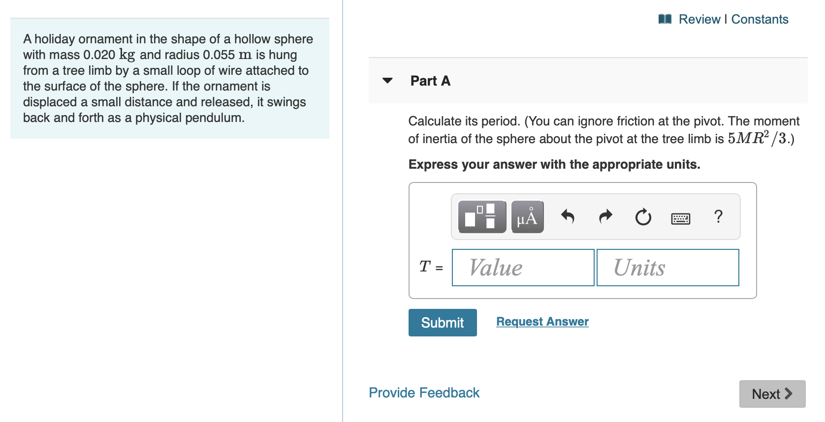 Part A Calculate its period. If the ornament is displaced a small distance and released it swings back and forth as a physical pendulum with negligible friction. CP A holiday ornament in the shape of a hollow sphere with mass M 0015 kg and radius R 0050 m is hung from a tree limb by a small loop of wire attached to the surface of the sphere.